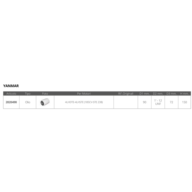 Oil filter dim.Ø ext.mm.90 Ø gasket mm. 72 height mm.150 pitch 1' - 12 UNF
