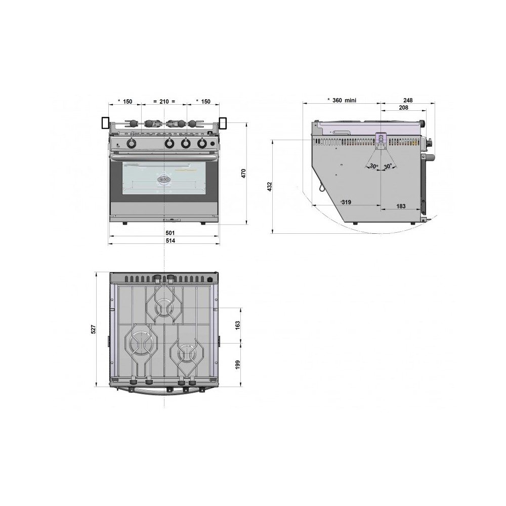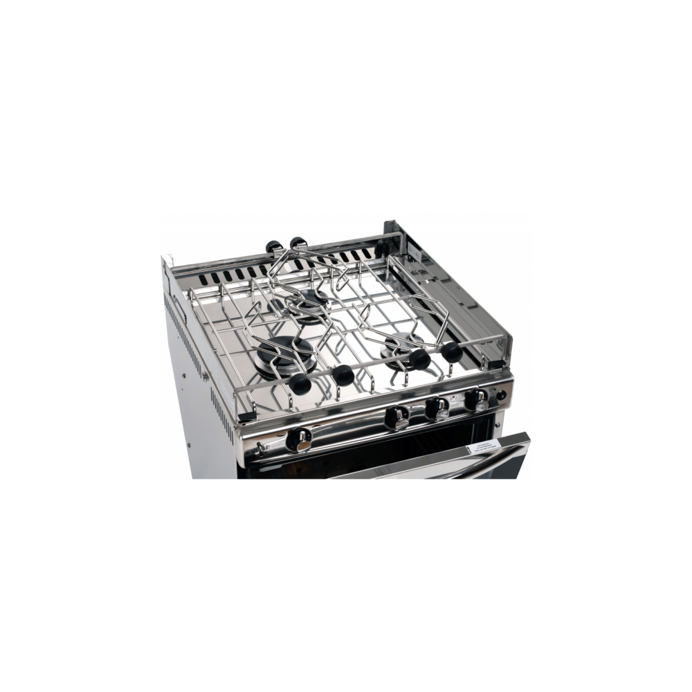 Stainless steel 3-burner stove with tempered glass door, oven (19 L capacity, 1500W capacity) equipped with grill (1350W capacity). Equipped with safety thermocouple, side flame guards, cast-iron burners, anti-roll pan retainer, oven door lock and gimbal support (tilting). Beveled back to facilitate side installation. Electric ignition. Use with propane/butane gas, connection pressure 30 mbar.