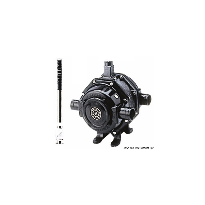 Consists of two MKV pumps combined. Removable handle. Version for concealed mounting behind bulkhead, with trapdoor (to be ordered separately). By removing the fittings at the inlet, you can virtually have two separate pumps and suction from two different bilges, even if one is dry.