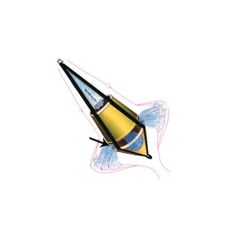 Constructed of highly durable materials, the double-cone profile creates a special turbulence that increases the effectiveness of the "Seabrake" as the sea force increases. Water escapes from the 4 drains at the base, keeping buoyancy constant. Nine possible uses: 1) floating anchor; 2) anti-glide anchor, reduces the risk of oversteering and gliding; 3) anti-roll in roadstead; 4) emergency tacking; 5) stabilizes the boat when towing; 6) anchor and drift; 7) brake; 8) stabilizer; 9) emergency rudder.