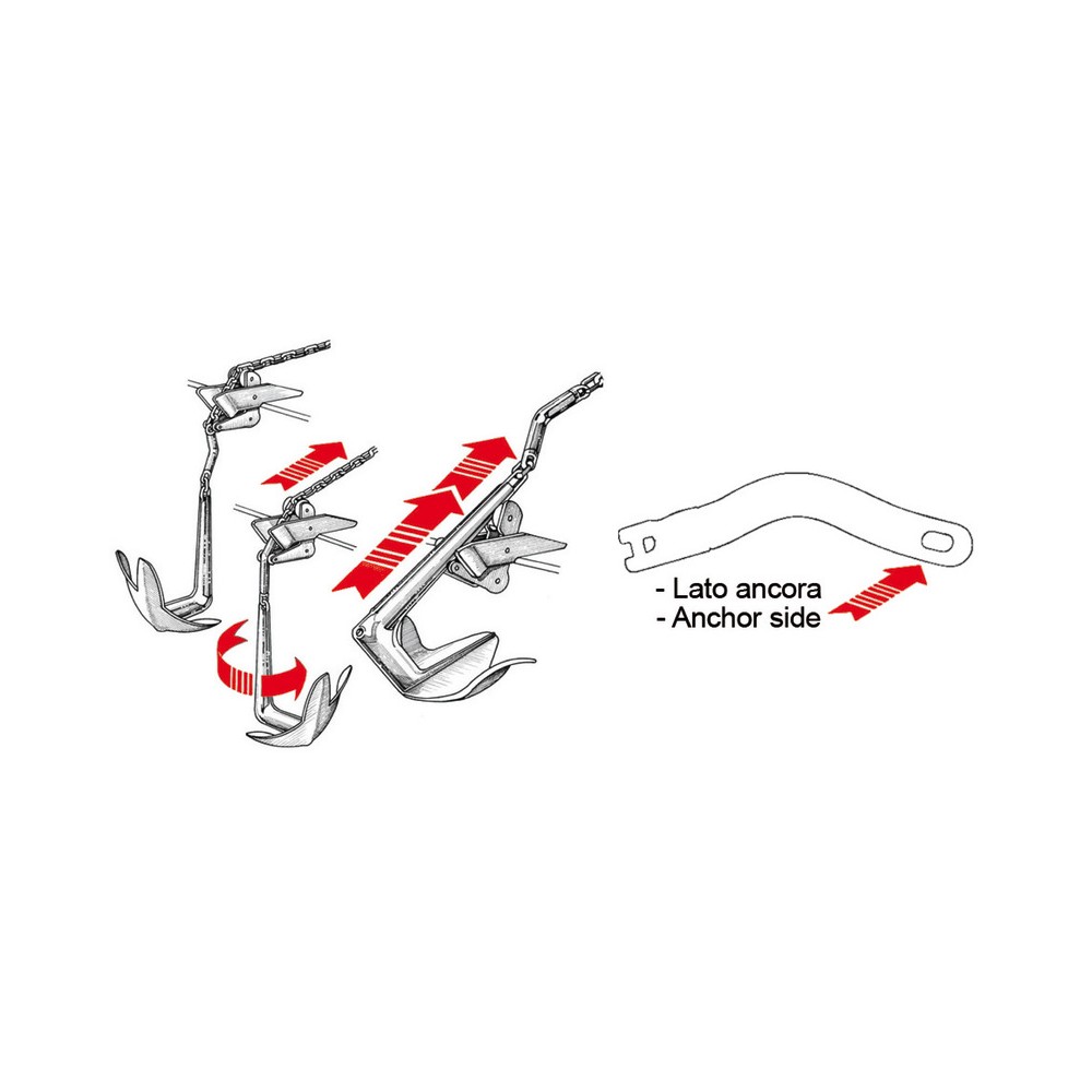 Made of AISI 316 stainless steel with a mirror-polished finish. Modern asymmetric anchors, such as Bruce, Delta, or Trefoil®, often tend to rise when turned the wrong way. This anchor joint solves this problem by automatically rotating the anchor into the correct position as it enters the bow roller or hawsehole. The anchor is connected to the anchor via a shackle attached to the fixed eye.