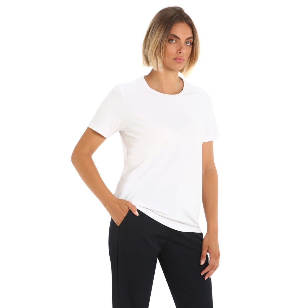Women's T-shirt made of lightweight organic cotton stretch jersey; Fabric is certified (GOTS); Lightweight, cool,comfortable and breathable; Short sleeves; Wide neckline; Custom sweatband on inside of neck; Logo on chest; Regular fit