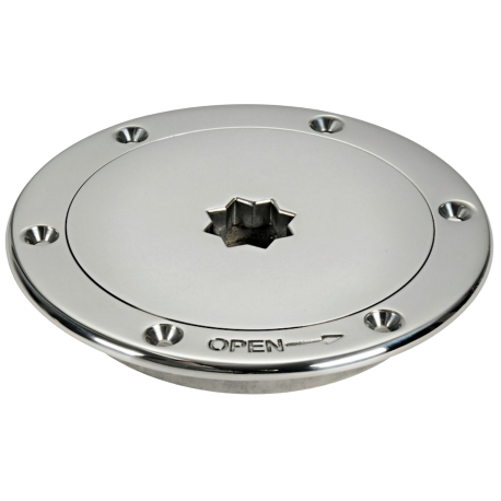 In aISI stainless steel 316. ¼ turn opening via winch handle. Cap remains attached to handle for easy lifting.