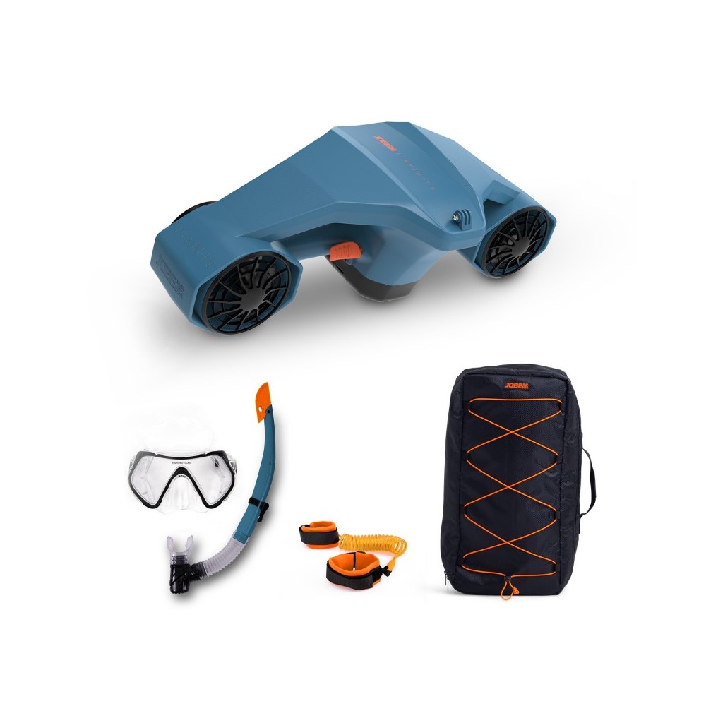 Three-speed electric-poweredself-float with a thrust of up to 15 kg, allows exploration of depths up to 30 meters. Powered by a battery with a battery life of about 40 minutes. Equipped with Go-Pro camera mount. Supplied with 2 batteries, mask, snorkel and waterproof bag.