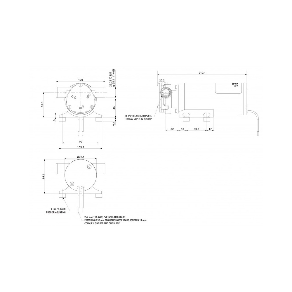 Circulation and bilge pump for professional applications, suitable for continuous operation. Self-priming up to 2.4m. Delivery 47 litres/minute max, 44 l/m at 3m height. With bronze pump head and oil-resistant nitrile impeller. Connections: 25mm (1") internal diameter hose directly to inlet/outlet ports or via 13mm (1/2") BSP male thread fittings (not included). Current draw 21A, 25A fuse. Dimensions: Height 9cm / Width 12cm / Length 22cm