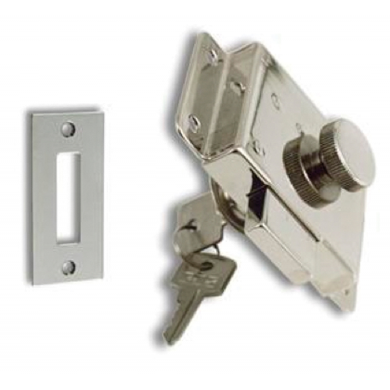 Kromattu messinkinen kaksoislukko, jossa uritettu nuppi sisäpuolella ja sylinterilukko ulkopuolella. Yleiskäyttöinen oikea- ja vasenkätinen.