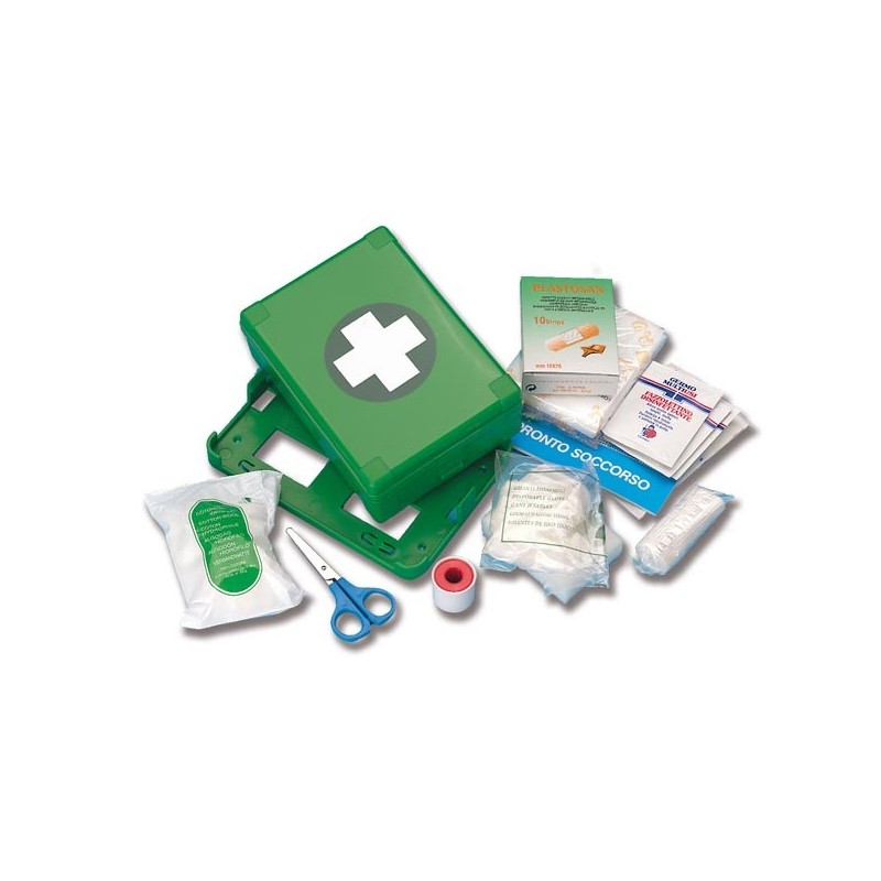 Täydellinen pakkaus, joka sisältää kaikki lääketarvikkeet. ABS-muovisäiliö, jossa saranat molemmilla puolilla ja seinäkiinnike. Ensiapulaukku.