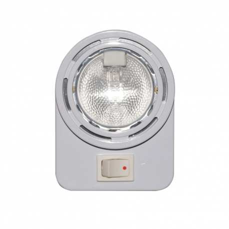 Halogeenikattovalaisin valkoista muovia, täydellinen kytkimellä, ulkoasennukseen. Mukana 10 W, 12 V polttimo. Mitat: Ø 66 x 90 mm, ulkonema 21,5 mm. 3 kiinnitysreikää.