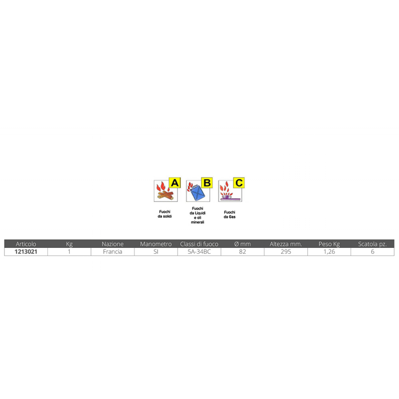 Alumiininen jauhesammutin, jossa on teline. Sertifioitu RINa.:n, MED 2014/90/EU, EN3, CE 0029/2017, PED 2014/68/EU:n mukaisesti. Ne luokitellaan niiden kyvyn mukaan sammuttaa erityyppisiä tulipaloja. Kerroin osoittaa sammutuskyvyn ja kirjain osoittaa sammutettavan tulipalon tyypin. A - Kuivien materiaalien (paperi, puu, tekstiilit jne.) palo B - Nesteiden (hiilivedyt) palo C - Kaasujen (butaani - propaani) palo. Mitat: Ø 82 mm x k 295 mm