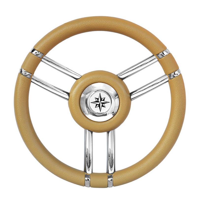 6-puolainen ohjauspyörä, Ø 16 mm, kaareva, peilikiillotettua ruostumatonta terästä. Polyuretaanipäällysteinen alumiininapa, ruostumattomasta teräksestä valmistettu suojus, jossa on kompassiruusu-logo keskellä. Pehmeä polyuretaanista valmistettu kahva. 7° kallistus. Yleiskartio.