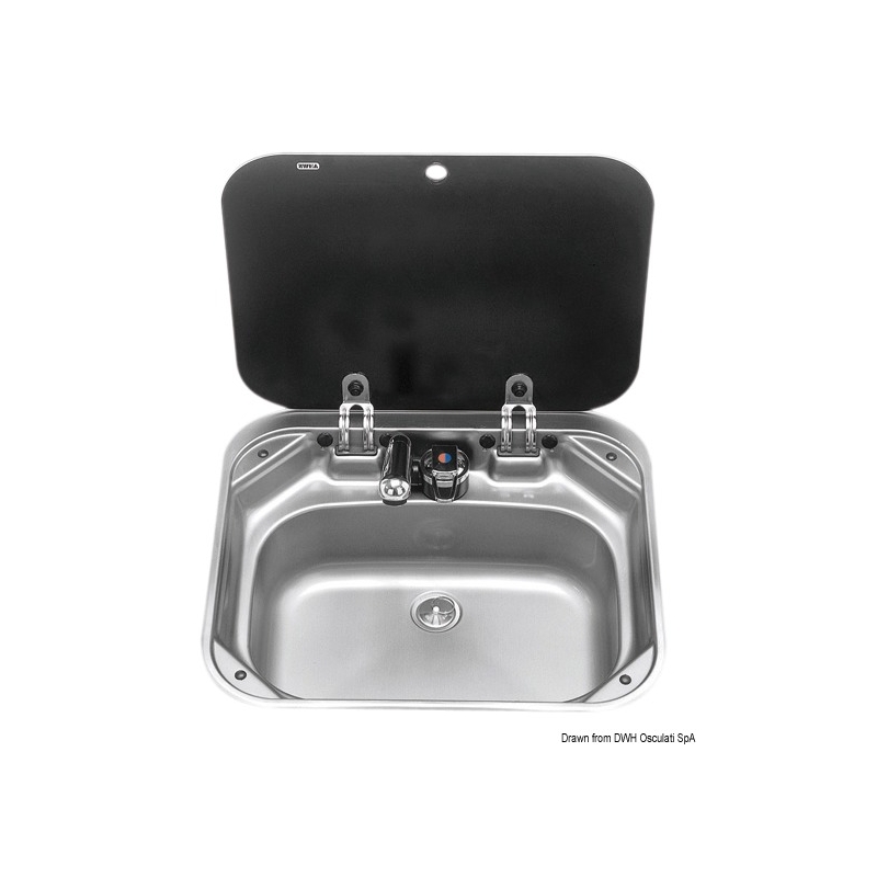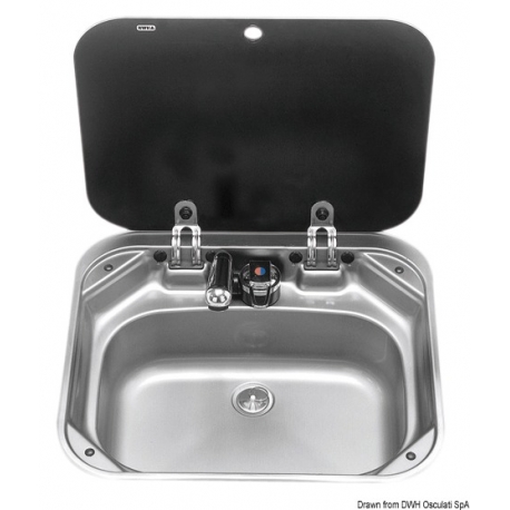 SMEV ruostumattomasta teräksestä valmistettu allas, jossa on savukarkaistusta lasista valmistettu kansi