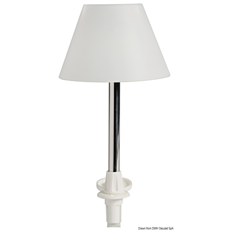 Virta syötetään jalan 13.440.10 kautta (myydään erikseen). Ruostumattomasta teräksestä valmistettu napsautuskiinnitteinen tanko. Muovinen varjostin.