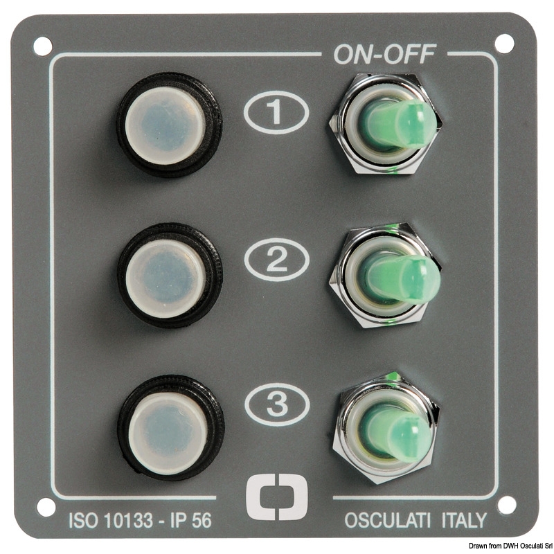 ON-OFF-kytkimet ensimmäistä (ON-OFF-ON) ja viimeistä (ON-OFF) lukuun ottamatta ovat varustettu jousipalautuksella äänimerkkiä varten. IP56-suojausluokka. Valaistut vipukytkimet. Nollattavat automaattisulakkeet. Alumiinilevy , maalattu epoksihartseilla.