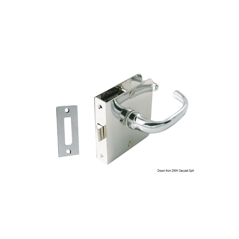 Kromatut messingistä valmistetut lukkorunko-osat 15 mm paksuihin oviin. Sisältää vastalevyn, parin ruostumattomasta teräksestä valmistettuja levyjä ja parin 84 mm kahvoja.