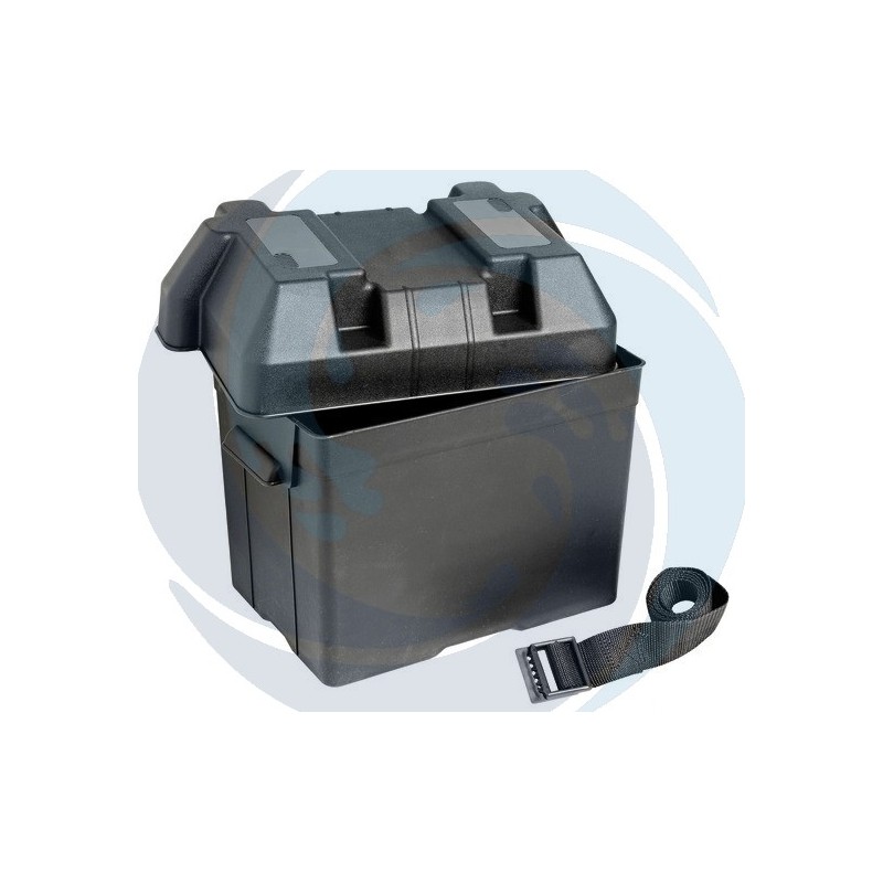 Akkukotelo, jossa on hihna ja kiinnitysklipsit. Suositellaan enintään 65 A:n akuille.