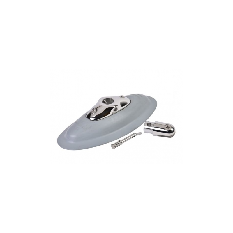 Lijmsteun voor opblaasboten, gemaakt van grijs rubber en roestvrijstalen vork. Afmetingen: 205 x 10 mm.