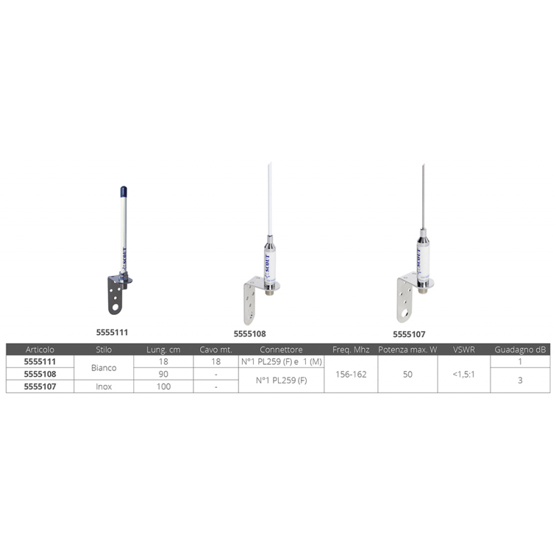 Draadloze antenne met voetconnector en roestvrijstalen spriet. Uitgerust met een L-voet voor masttopmontage. Maximaal vermogen 50 W en antenneversterking van 3 dB.