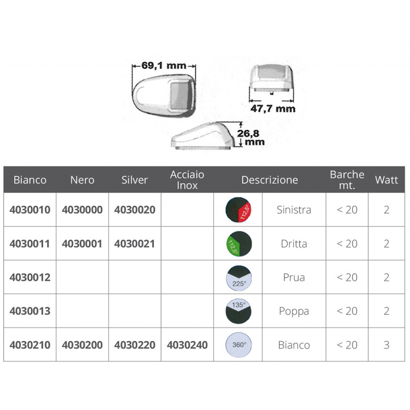 LED-navigatieverlichting met extreem helder licht, levendige kleuren, lenzen met hoge resolutie, een innovatief, gepatenteerd ontwerp en geavanceerde elektronica. Voeding: 12-24 V, gemiddelde levensduur circa 10.000 uur, voldoet aan IMO COLREG 1972 nr. ELE453105CS, beschermingsgraad IP56.