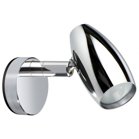Richtbare binnenspot van chroomkleurig aluminium, voorzien van schakelaar. Warmwit licht (140 lumen). Wandmontage met schroeven. Polariteitsgevoelig.