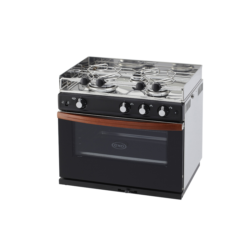 Driepits roestvrijstalen fornuis met gehard glazen deur, echt houten handgreep, oven (inhoud 19 liter, vermogen 1500 W) met grill (vermogen 1350 W). Uitgerust met veiligheidsthermokoppel, vlambeveiliging aan de zijkant, gietijzeren branders, anti-pandragers, ovendeurvergrendeling en cardankoppeling (kantelbaar). Elektrische ontsteking. Geschikt voor propaan-/butaangas, aansluitdruk 30 mbar.