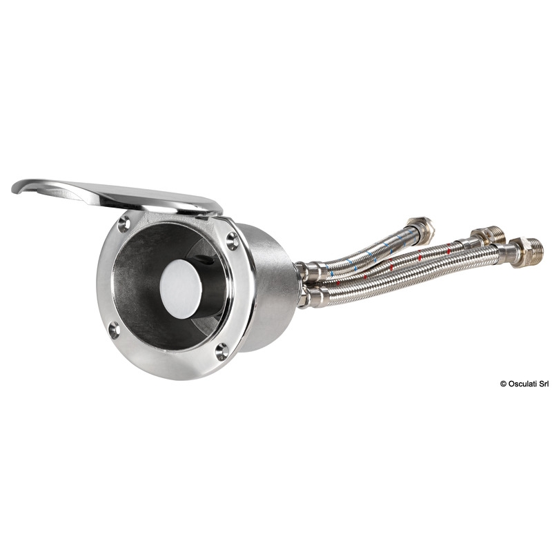 Douchewand van roestvrij staal AISI 316 met zelfdragende deur. Uitgerust met een mengkraan met cilindrische knop.
