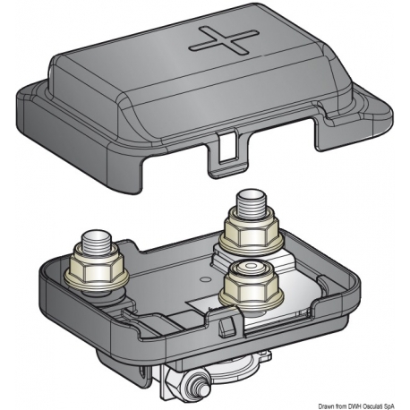 Thermoplastische doos met deksel, te gebruiken op de positieve batterijpool.