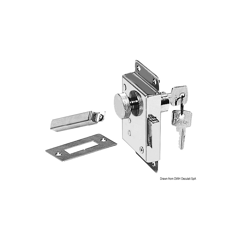 Gemaakt van verchroomd messing , kan op de vloer worden geplaatst, met een cilindersleutel aan de buitenkant en een knop aan de binnenkant. Het is een zeer praktisch slot, geschikt voor deuren, compleet met een sluitplaat.