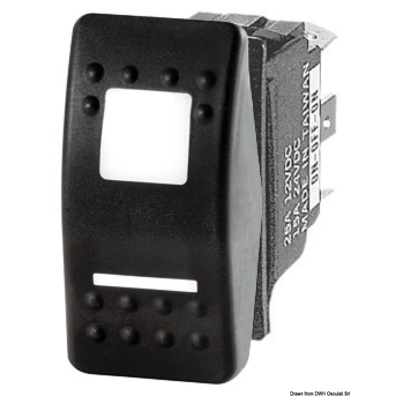 Waterdichte IP56 Marina-serie, vereist een rechthoekig gat van 21,5x36,8 mm voor installatie. Maximale capaciteit 20 A bij 12 V en 12 A bij 24 V. Compleet met dubbele rode led : één die het gebruikerssymbool verlicht ( altijd aan) , de tweede die een speciale gleuf onder het symbool verlicht die oplicht wanneer de gebruiker is geactiveerd. Tuimelschakelaar apart te bestellen.