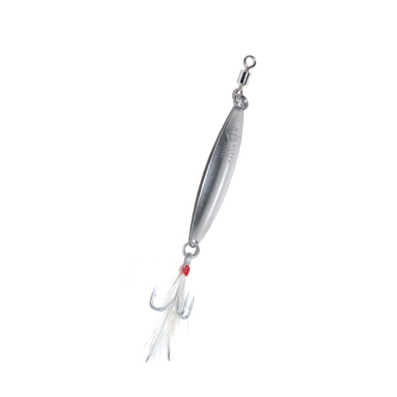 Zoutwaterlepel (trollen, spinnen) van roestvrij staal ASI 316 met vernikkelde wartel en corrosiebestendige Perma Steel dreg. Veeruitvoering. Verkrijgbaar in verschillende maten.