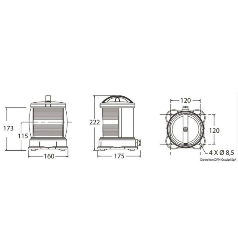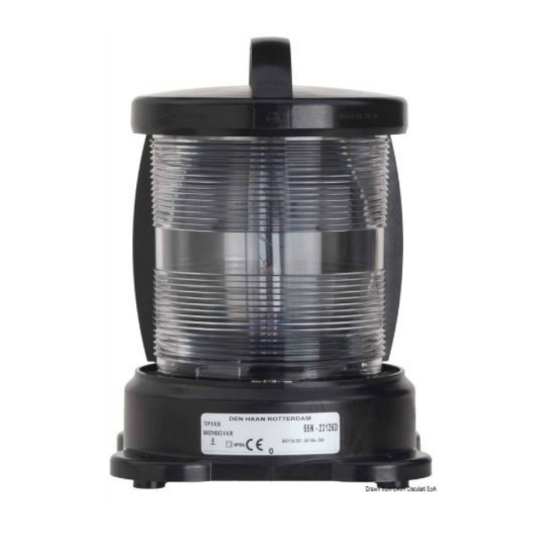 Gemaakt van zwart polycarbonaat en roestvrij staal. Compleet met een speciale verticale gloeilamp. Met MED 96/98 - EG- en koopvaardijgoedkeuring.
