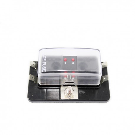 Polycarbonaat zekeringkast voor standaard steekzekeringen, met transparante deksel en waarschuwingsled voor doorgebrande zekeringen. Totale capaciteit 100 A, 30 A uitgang per lijn.
