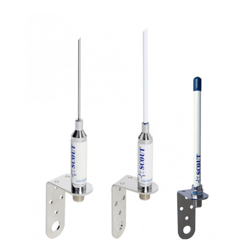 Trådløs antenne med basekontakt og pisk i rustfritt stål. Utstyrt med en "L"-sokkel for montering på mastetopp. Maks. effekt 50 W og antenneforsterkning på 3 dB.
