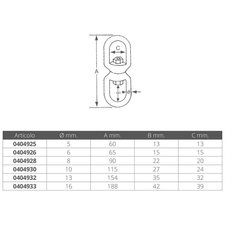 Øye-øye-svivel i rustfritt stål AISI 316.
