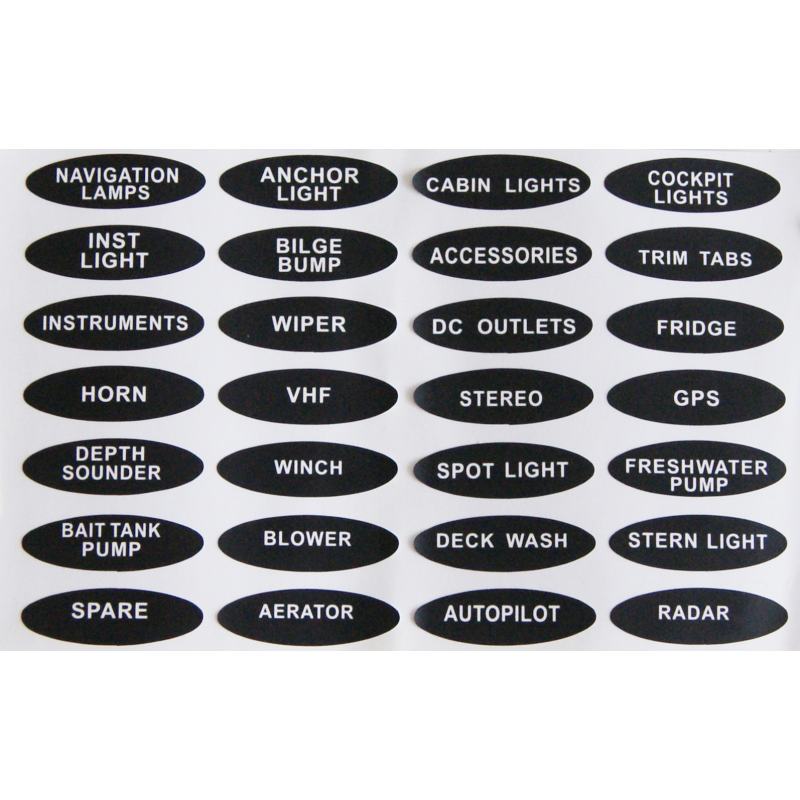 Elektrisk panel i UV-bestandig ABS, vippebrytere beskyttet av gummihetter, med 15 Amp flatsikringer i ledningen bak panelet og selvklebende symboler.