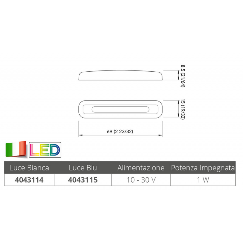 Vanntett IP65-komfortlampe med 4 LED-lys, laget av plast med blank overflate, med en diffuser som projiserer lyset fremover. Naturlig hvitt eller blått lys. Skrubar på. Polaritetsfølsom.