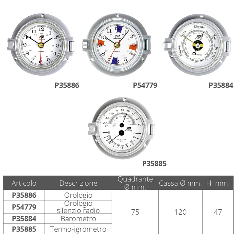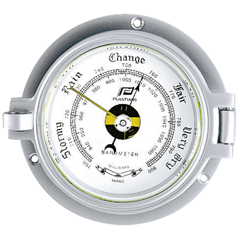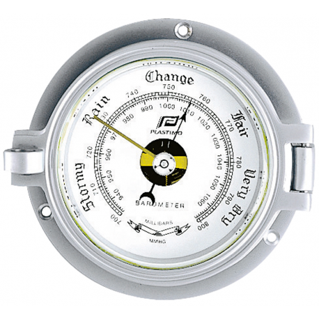 Barometer i matt forkrommet aluminium med høyfølsomt presisjonsaneroidurverk, integrert metallkjede, avfaset mineralglass. Modell som kan åpnes.