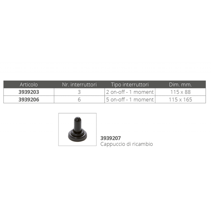 El-panel i svart ABS, med vippebrytere beskyttet av gummihette og sikringsholdere komplett med 5 AMP glasssikringer (6,3x32).