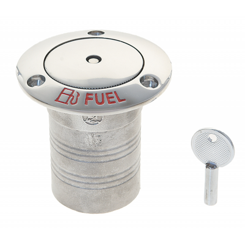 Dekkpåfyllingslokk i støpt rustfritt stål AISI 316, speilpolert, helt i flukt, med sikkerhetsvaier og returfjær i rustfritt stål. For å åpne, trykk og roter den øverste delen som automatisk spretter ut slik at du kan skru av selve korken.