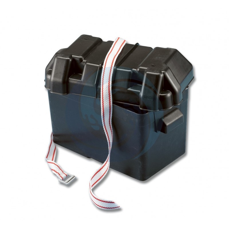 Batteribokser for 100A-batterier. Laget av støtsikker polypropylen. Utstyrt med stropp med justeringsspenne for lukking av lokket.