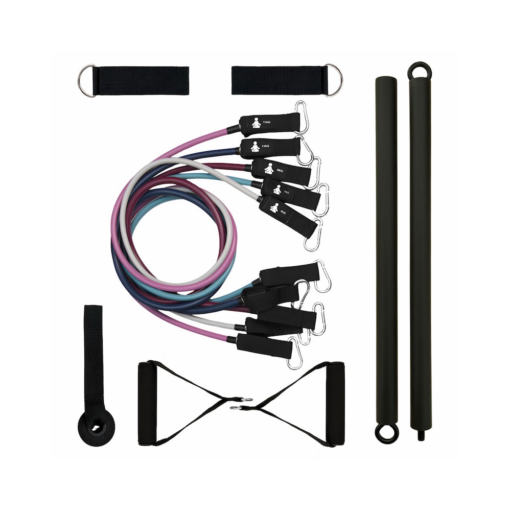 Sett med 5 elastiske bånd, ergonomiske håndtak, modulær stang, døranker og ankel-/håndleddsstropper, ideelt for komplette og personlige treningsøkter.