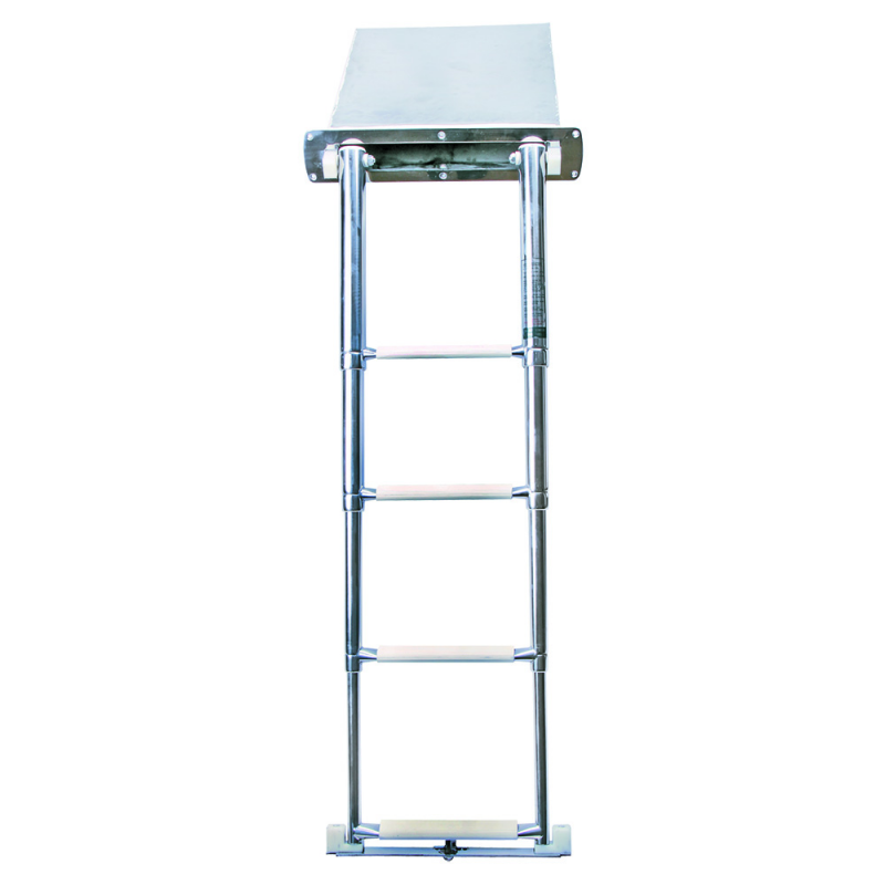 Teleskopisk infällbar stege och låda i rostfritt stål AISI 316. Lådan är infälld i plattformen. Snäpplåsfunktion.