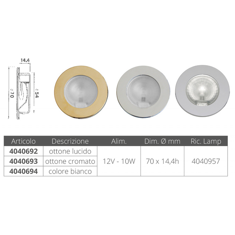 Recessed halogen spotlightin thermoplastic material external Ø mm. 70, hole Ø mm. 54,thickness mm. 14.4. Frosted safety glass, complete with halogen bulb 12V 10 W art. 4040957. 3 fixing holes.
