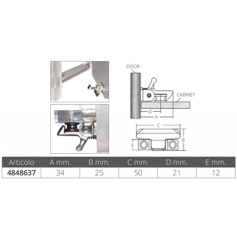 Automatisk låsanordning i rostfritt stål AISI 316, idealisk för installation på dörrar och skåp. Utformad för diskret installation. Utrustad med ett inbyggt markeringshål för att säkerställa korrekt uppriktning under installationen. Mått: 50x40x25 mm.
