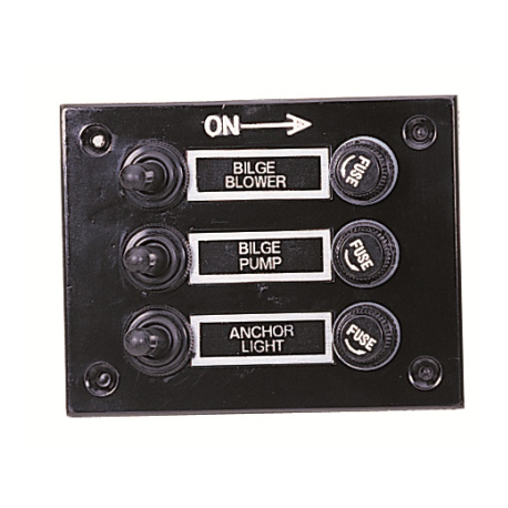 Svart ABS-elpanel med vippströmbrytare (2 x PÅ-AV och 1 x återkopplingsbar) skyddad av gummikåpa och säkringshållare komplett med 5 Ampere glassäkringar (6,3x32).
