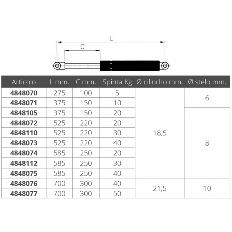 Gasfjäder för öppning av dörrar, motorhuvar etc. Spindel, cylinder och beslag i rostfritt stål, öljetter med Ø mm. 8 hål. Mått: Längd mm. 375, Slaglängd mm. 150, Dragkraft kg. 20, Cylinder Ø mm. 18,5, Spindel Ø mm. 6.