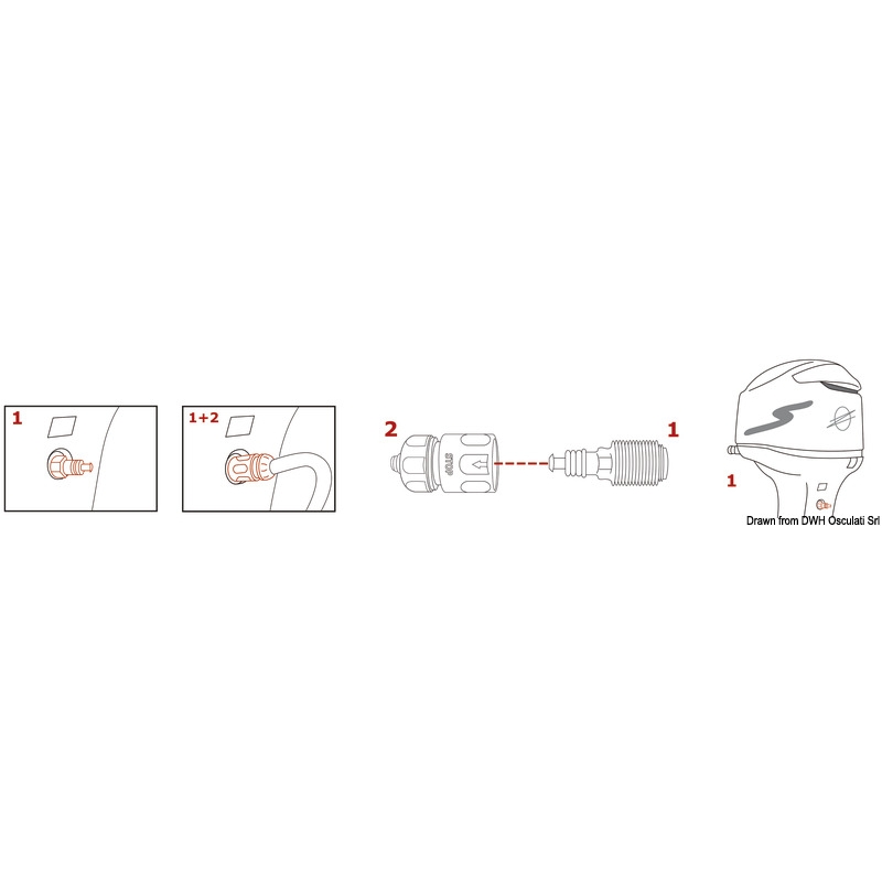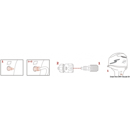Spolsystem för utombordsmotorer med gängad anslutning. Systemet består av en speciell gängad ventil och snäppkoppling (36.189.02). Ventilen kan installeras permanent på utombordaren.