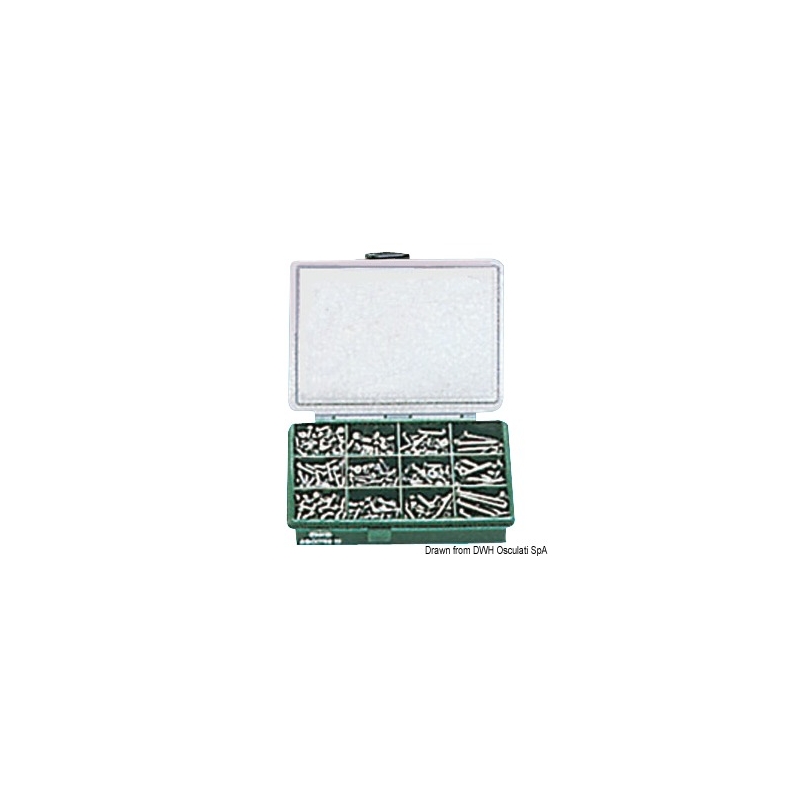 Mått : A2 AISI 304 175x145x32 mm. Totalt antal bitar : 390. Innehåll : 46 sexkantsskruvar (DIN 933); 64 försänkta skruvar (DIN 963); 90 sexkantsmuttrar (DIN 934); 40 självlåsande sexkantsmuttrar (DIN 982); 90 brickor (DIN 125); 60 brickor tre gånger hålets bredd.