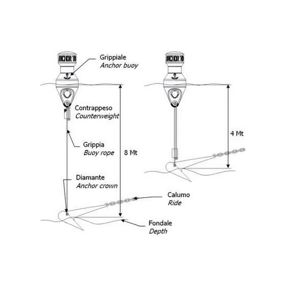 Ankarboj för att indikera ankarets exakta position, komplett med självjusterande rep från 4 till 10 m och komplett med blymotvikt