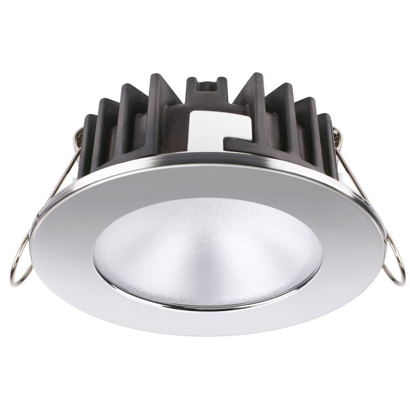 Vattentät IP66 POWER LED-spotlight (220 lumen) med mycket hög ljusstyrka, varmvitt ljus med rund ram i polerat rostfritt stål AISI 316. Polaritetskänslig.